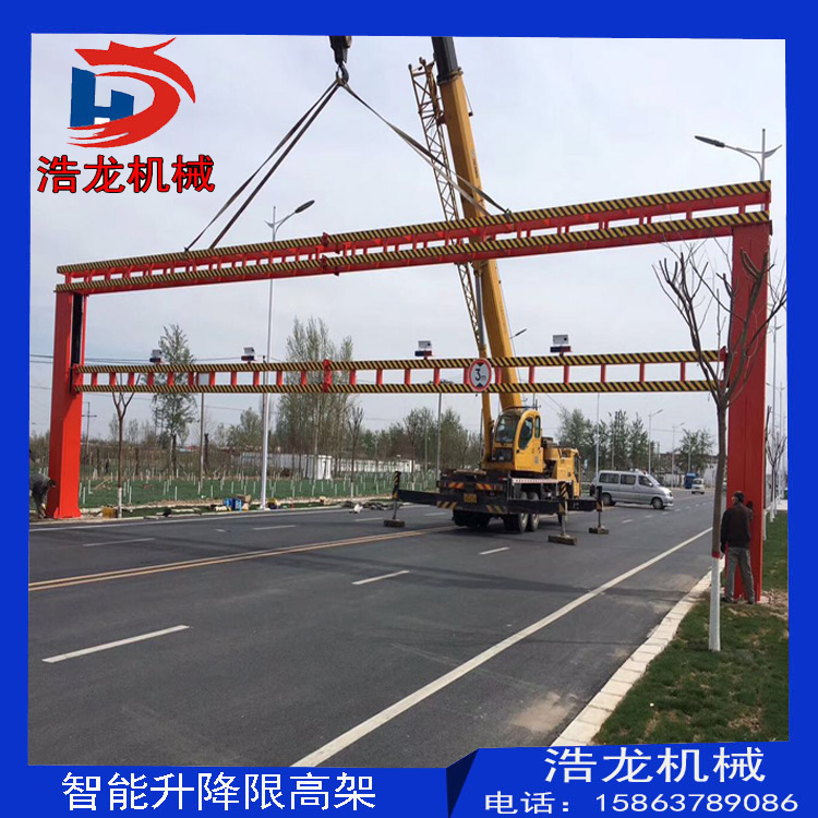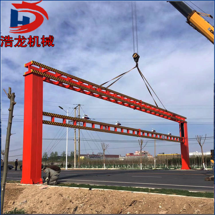智能電動升降式限高架:公路龍門架、標(biāo)志牌龍門架、簡易龍門架、led顯示屏龍門架,限寬龍門架,限高龍門架的安裝指南:1.安裝前確認(rèn)是否通車,無通車時直接進(jìn)場安裝,通車時與甲方確認(rèn)進(jìn)場許可,封路時間及時段,以避開上下班高峰期,一般選擇非節(jié)假日,凌晨6點(diǎn)安裝為宜。進(jìn)場后派員工一人先把基礎(chǔ)墩清掃出來,把地腳螺栓包裹的絲牙清潔干凈,用黃油把絲牙和螺母潤化,把定位法蘭處上的泥沙等清潔干凈(注意:打掃的面積至少大于底法蘭板的規(guī)格為宜),在確認(rèn)安裝地標(biāo)無誤時,依次把龍門架的部件從車上吊放在地上,請不要疊放,以平放組裝方便為原則,派員工一名把顯示屏龍門架的橫臂與立柱連接高強(qiáng)螺栓按數(shù)量規(guī)格拿出來,還有配置的相關(guān)扳手等工具,合部件從車上吊下來后,首先把龍門架橫臂放倒一側(cè)(即正面安裝LED顯示屏一面朝上)然后把“左立柱”(記?。糊堥T架在基礎(chǔ)混凝土澆筑時一般會有偏差,比如平行度和標(biāo)高等。因此龍門架在制作前就要把立柱標(biāo)記左立柱和右立柱,這樣在運(yùn)輸和安裝時才方便配單和裝下貨等)與橫臂的左側(cè)法蘭連接起來,螺栓不要擰得太緊要有一定的松動,接下來再把“右立柱”連接固起來,這時把事先準(zhǔn)備好的5噸至10噸相對量的鋼絲繩和吊帶準(zhǔn)備好,穿過橫臂的中間處,注意不要放得太近,吊車的吊鉤與龍門架之間距離至少有3米以上為宜(這便于在高空作業(yè)時,吊車司機(jī)操作方便,視覺更好)再接下來吊車慢慢升起把整座公路龍門架吊起來,一般離地面500mm以內(nèi)為宜,至到基礎(chǔ)墩處時再提高即可,這中間安裝人員用扳手?jǐn)Q住底加強(qiáng)筋處,讓其不亂擺動,注意整個安裝過程中需有一名安全指揮員,且每人配一個對講機(jī)(最后是肩負(fù)式,非手持式,這樣利于作業(yè)),等標(biāo)志牌龍門架底法蘭全部與基礎(chǔ)地腳螺栓籠對位后,迅速擰緊底法蘭螺螺栓,這過程中吊車不能動直接吊放在原位,另一組安裝公司用事先準(zhǔn)備好的梯(7米左右即可)攀登到橫臂處時擰緊橫臂與立柱的法蘭,注意一定要加雙螺母,加彈簧墊,手工制作平墊,螺栓頭在上部,全部檢驗(yàn)無誤后,上橫臂把吊繩取下來,吊車復(fù)位,衛(wèi)生清場,封路標(biāo)識設(shè)備等撤離等!